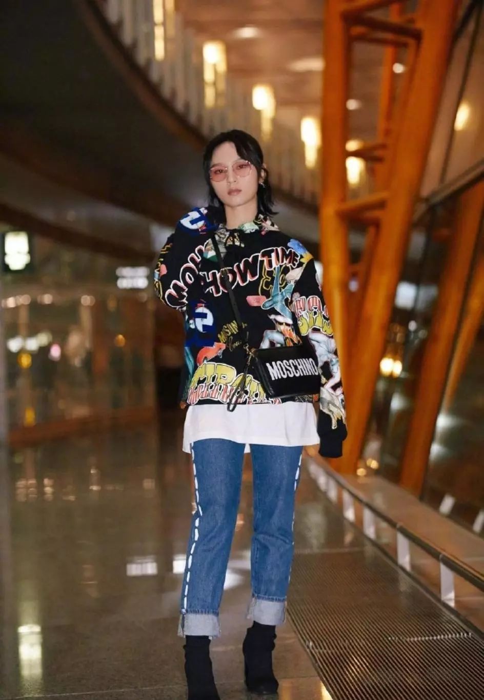 周笔畅身穿一袭黑色涂鸦连帽卫衣,充满趣味,搭配牛仔裤和黑色短靴,又酷又潮,帅气又时尚,元气满满,活力十足。