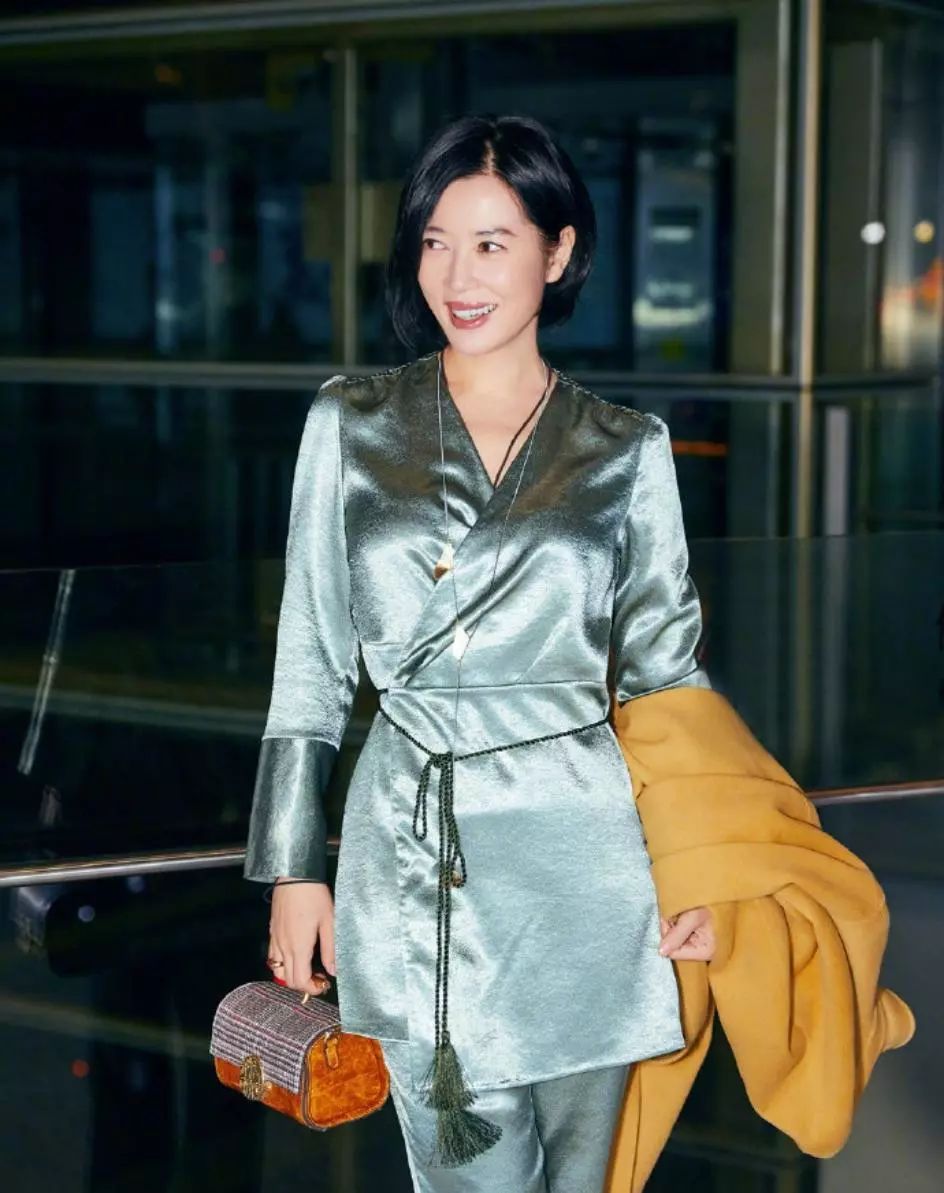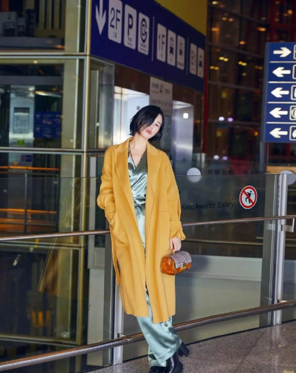 她身穿绿色套装彰显慵懒时髦范,V领衬衫+阔腿长裤,随性潇洒又不失知性与妩媚,亮面真丝材质更显高贵华丽,墨绿色流苏腰带的点缀增添灵动气息,优雅又时尚,外搭一件黄色大衣,明媚动人,英伦风格纹拼接包包别致又好看,整体Look简单又不失韵味,一头利落短发,酷帅气场足,尽显独特气质,满屏高级感。