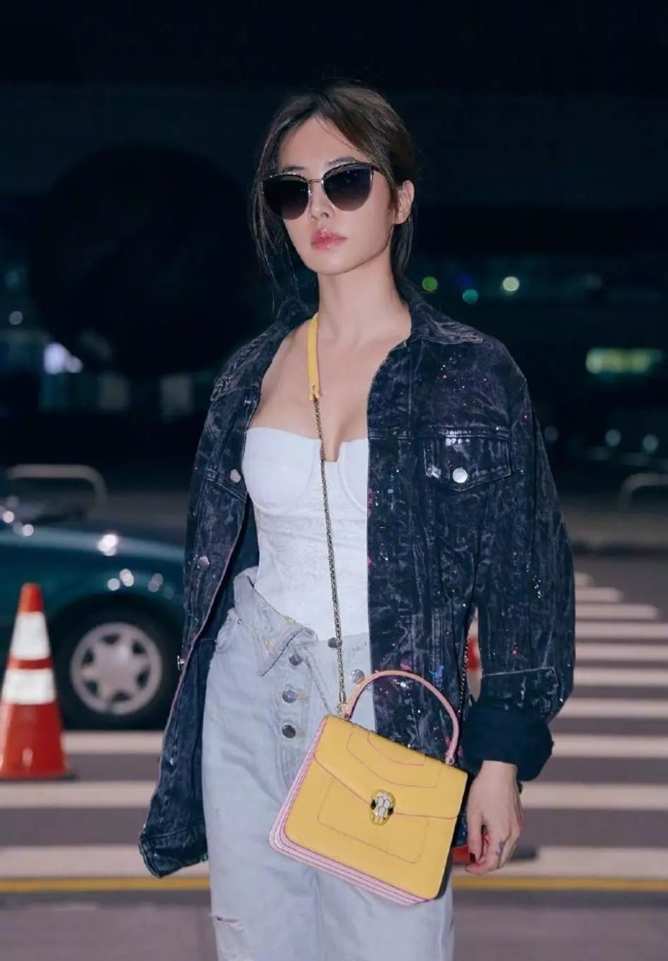 下身穿着一件洗水破洞又牛仔,潮酷十足,腰部设计别致又个性,脚踩黑色短靴加上墨镜遮面,气场全开,黄色与粉色拼接小包包为整体造型增添一抹亮点,活力满满又不失少女气息,整体Look非常吸睛,时尚满分。