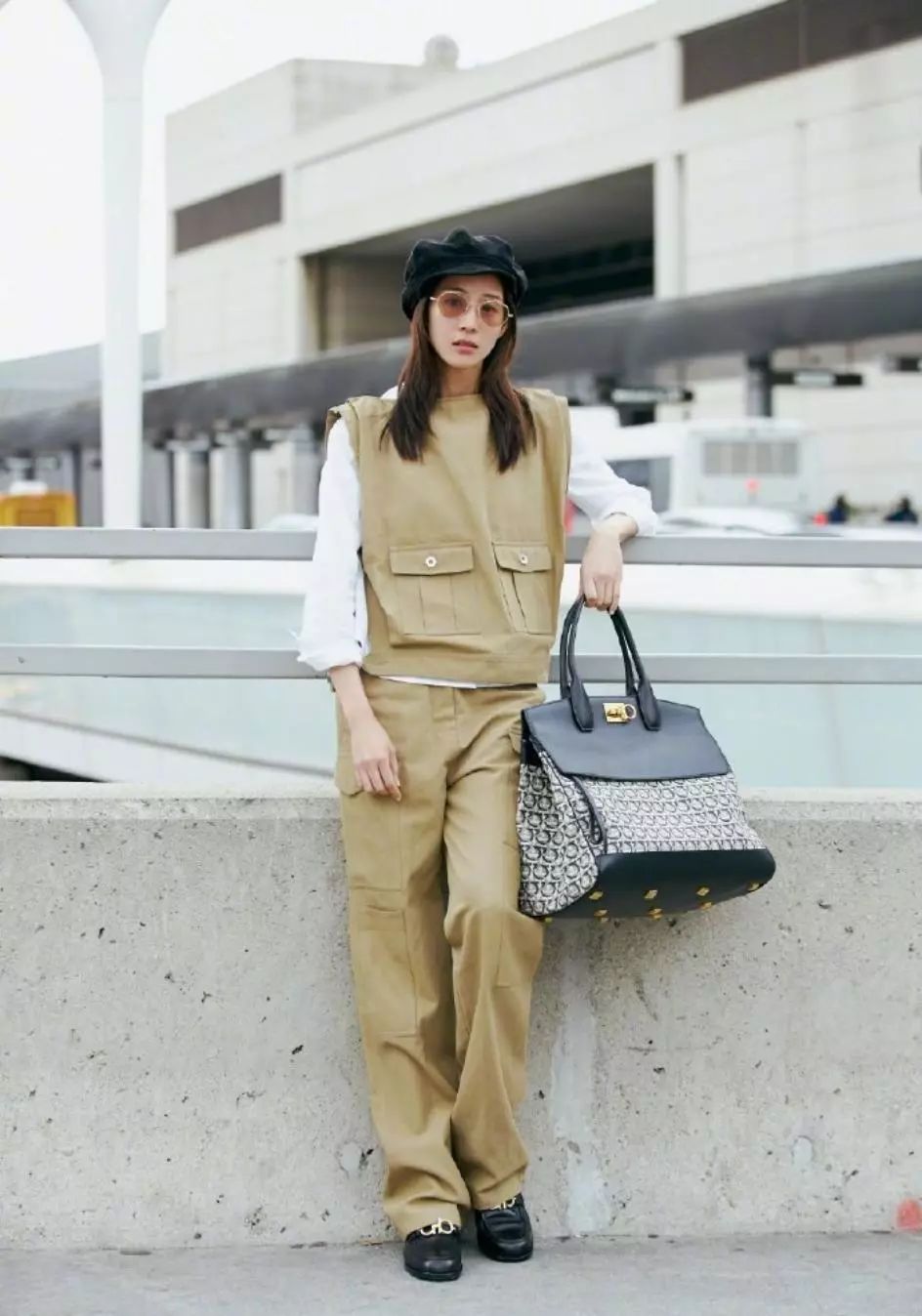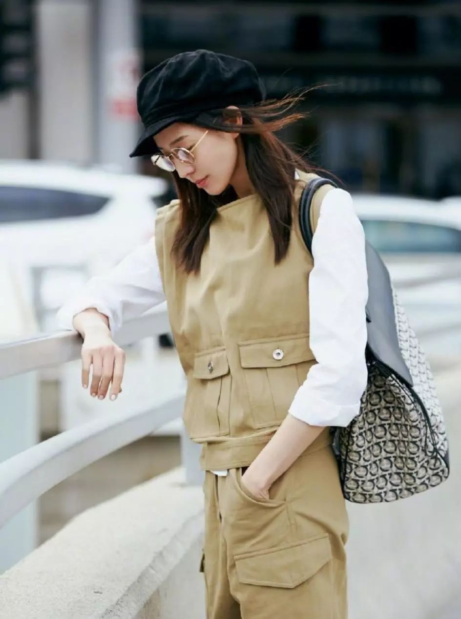 张钧甯不管何时都元气满满,一身清爽低调穿搭,舒适大方,卡其色工装无袖上衣搭配同色系长裤,硬郎帅气,搭配白色上衣颇有层次感又散发着一股小清新,黑色印花大包包尽显率性之美。