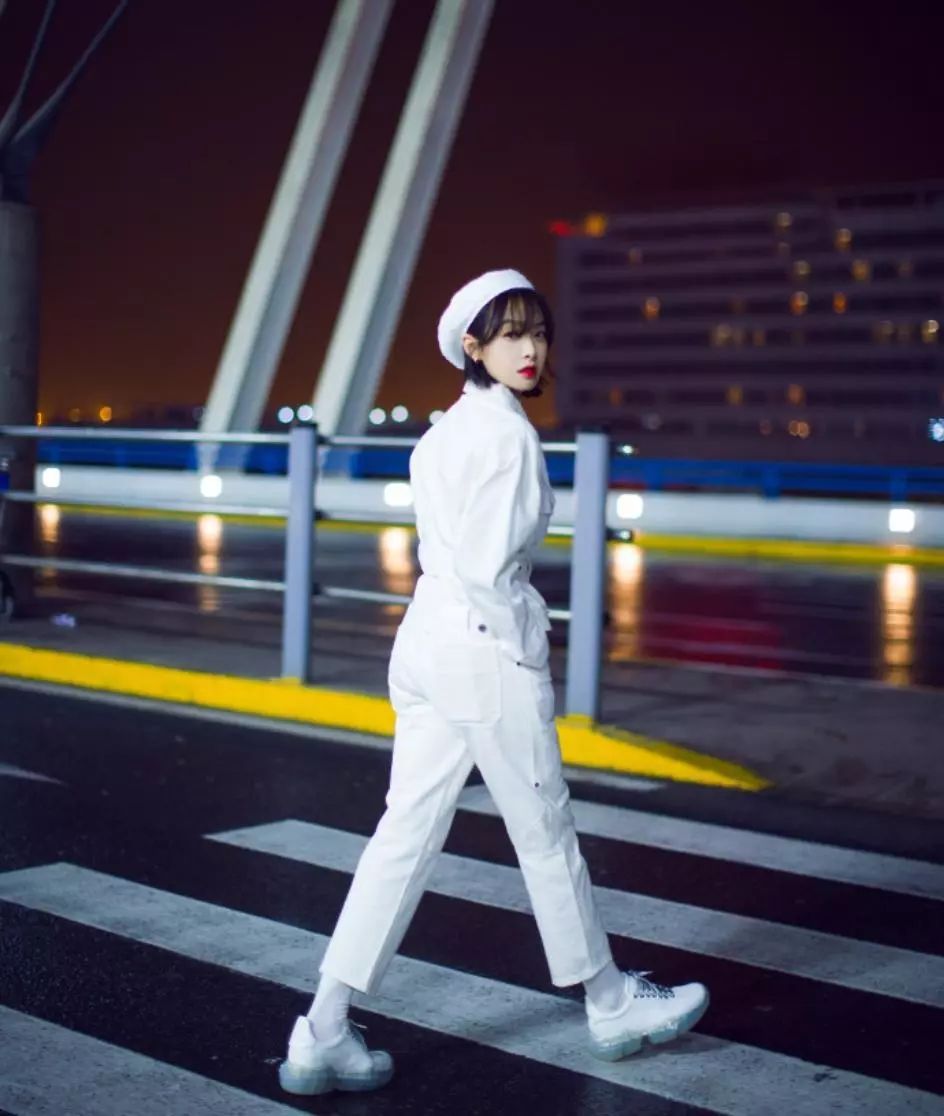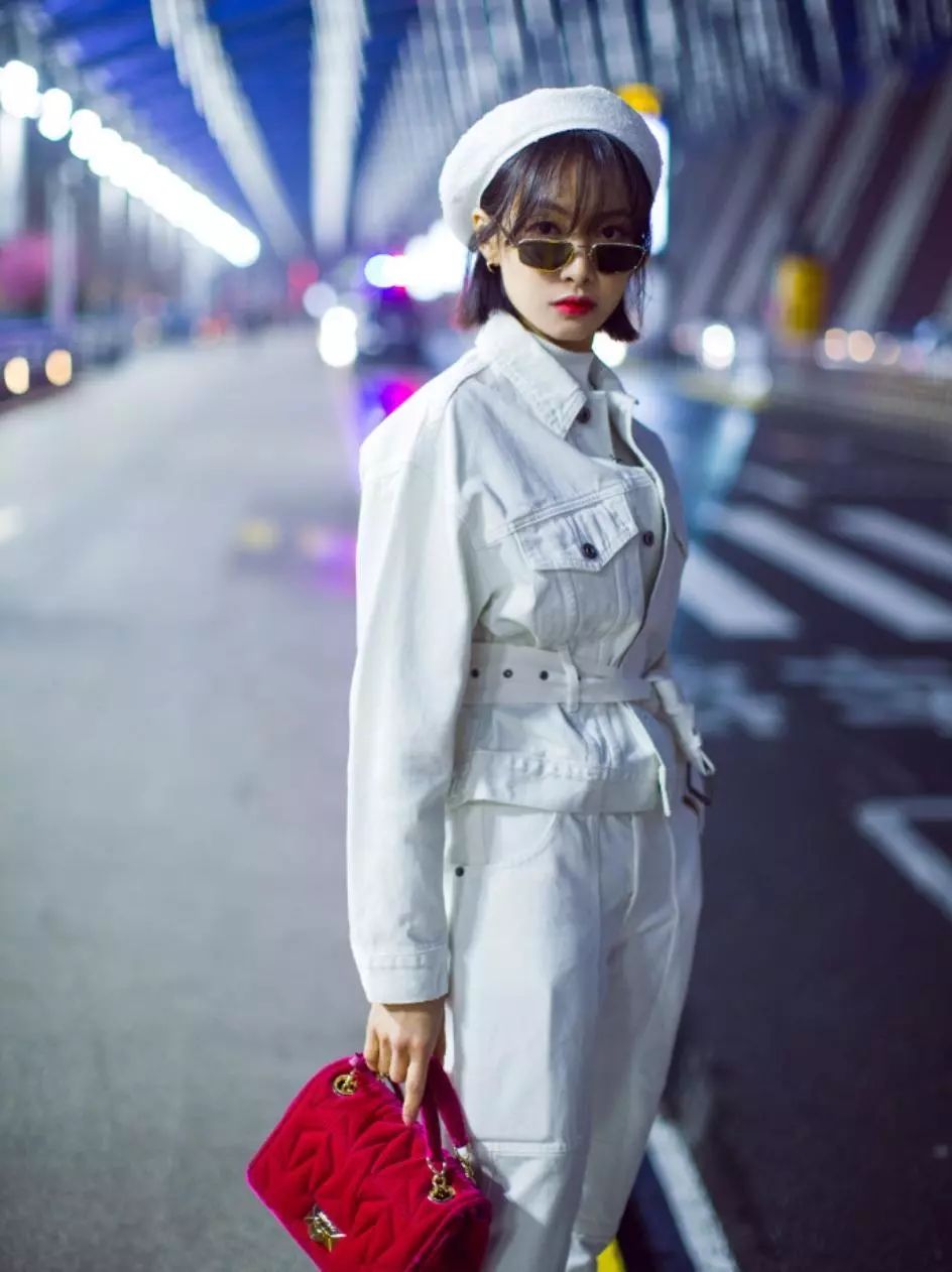 宋茜一身白色系Look,满屏小清新气息迎面扑来,白色上衣+白色长裤+白色贝雷帽,率性十足,腰带更显利落干练,彰显高挑身姿,满屏大长腿气场满满。
