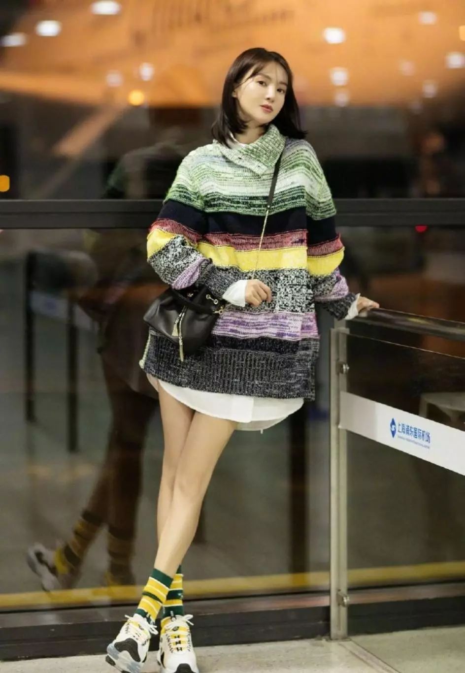 金晨身穿一袭彩色条纹毛衣搭配彩色条纹袜子,色彩明媚活泼,充满了春日气息,靓丽吸睛,白色衬衫衣摆外露,层次感十足,温婉优雅,玩起下衣失踪,大长腿抢镜,穿出小性感魅力,甜美可人。