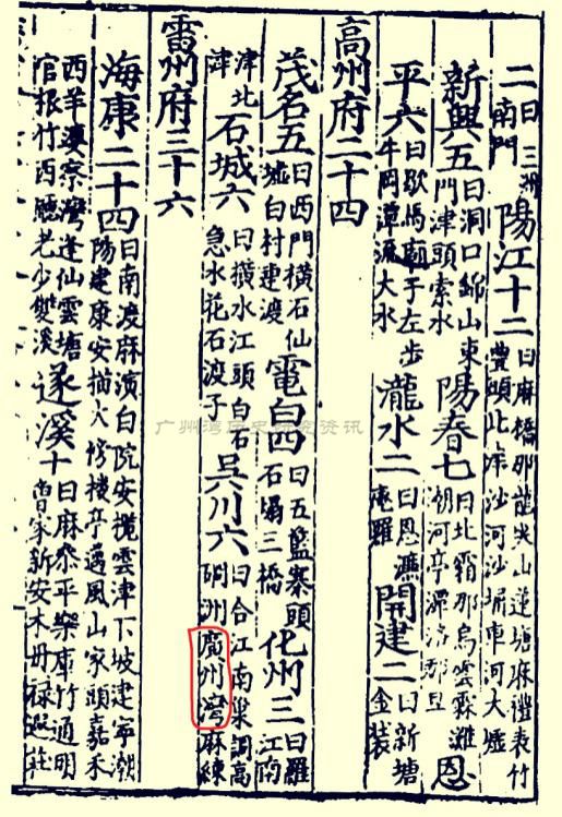 1535年(明嘉靖十四年),“广州湾”一词最早出现在我国古代文献中,系指高州府吴川县所属的六个渡口之一,与其并列的渡口还有合江、南巢、调高、碙洲(即今天的硇洲)、麻练。(戴璟修撰:《广东通志初稿》,卷三十八)
