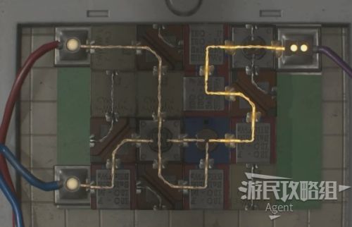 解谜思路是,左边两个黄色点的电力,都要接到右边紫色线上去。那么,两条线必在某处汇到一起,然后最终通往紫色线。那么紫色线这边的路线是可以确定的。