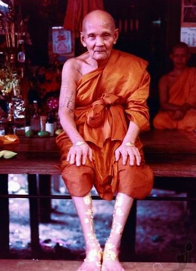 因為大师当苦行僧时,他到达地区有老虎為患,时有老虎咬人,但奇怪当见到大师时,不但不咬他,反而乖乖地坐下听大师说经,久而久之,大师便对老虎有了好感,其后大师所出的佛牌和為善信纹身都会有老虎的标记,在佛寺里亦有大师坐老虎的像供善信参拜。