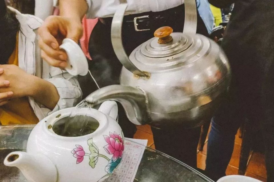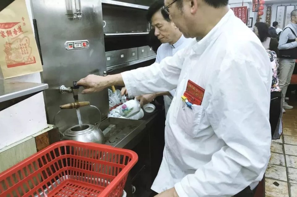 如今冲茶的大水煲,也从铜制已变成不锈钢,但依然放在茶桌地上的炉子上加热,侍应伯伯仍不时为大家沏茶。