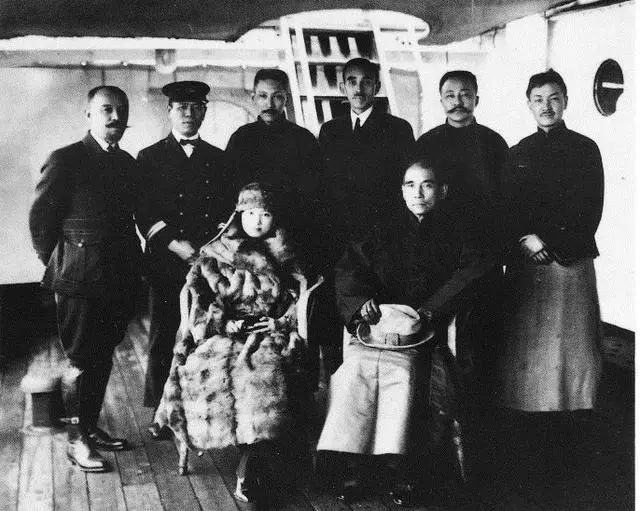 1924年11月30日,孙中山一行离神户赴天津。图为孙中山、宋庆龄、李烈钧在船上与随行人员合影