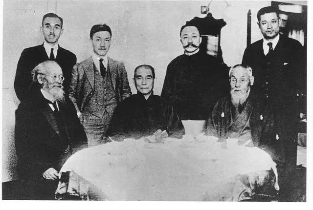 【1924年11月25日,孙中山在神户与前来拜访的头山满长谈,图为谈话后合影。前座左起:大久保高明、孙中山、头山满:后立左起:山田纯三郎、戴季陶、李烈钧、藤本尚则。】
