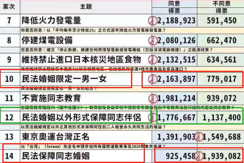 在去年11月24日的台湾公投中,民法婚姻限定仍是一男一女,而反对保障同性恋婚姻的票数,也是压倒性的。