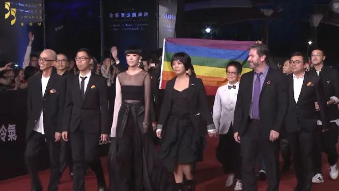到第55届金马奖,评审团入场时,举起的彩虹旗帜。