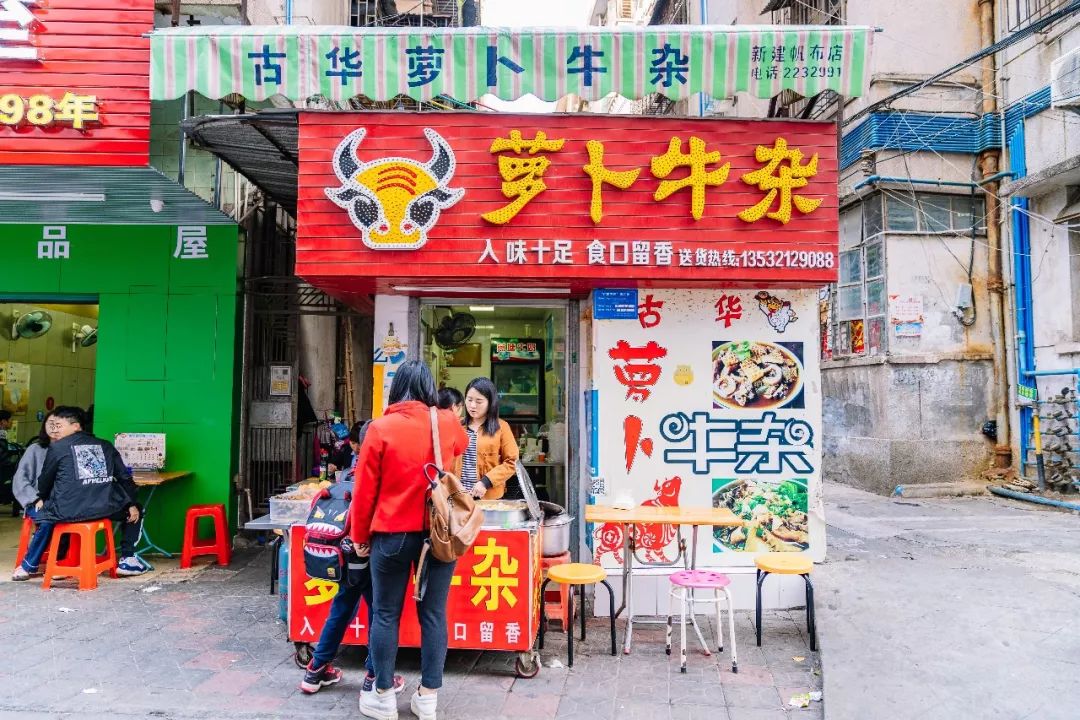 这家牛杂店的位置同样很好找,在步行街的十字路口处,人流量很大, 红色的招牌十分显眼。