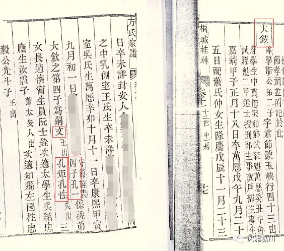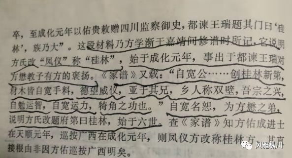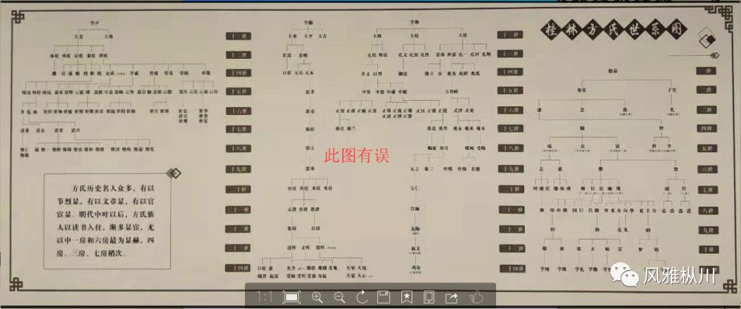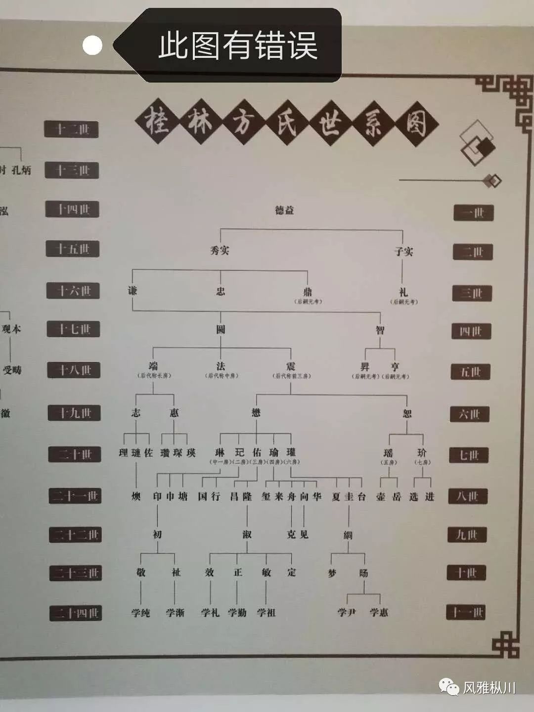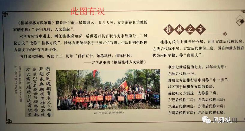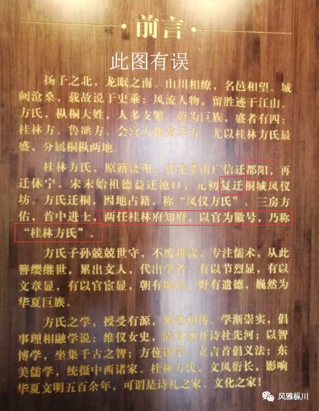 上图文中论述却备注来源自方学渐重修《桐城桂林方家谱》,实际上图文只节选了家谱一小段“方自宋末籍桐,历世十三,历年三百有五十年,始称凤仪,继称桂林。”(桐城桂林方家谱中并无学渐公有关“凤仪方”易名“桂林方”源自方佑公官职描述,而图文备注易让人产生误解,这样的结论在文化园中多次出现)。