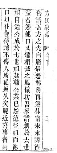 桐城桂林方家谱创于六世祖自勉公,成于七世祖廷辅公(方佑),尊德益为始祖,而池口以往仅传地不传人,所迁久远,德益往上世系已不可考。