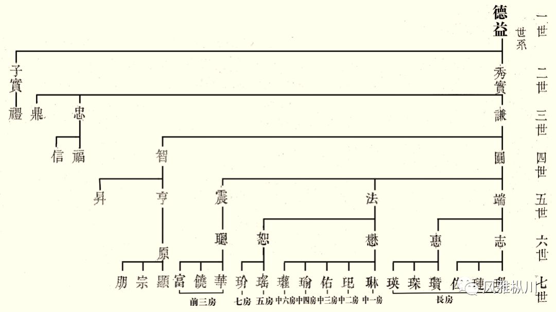 始祖德益公——二世秀实、子实——三世谦公——四世圆公(长子端公、仲子法公、季子震公)—— —— ——
