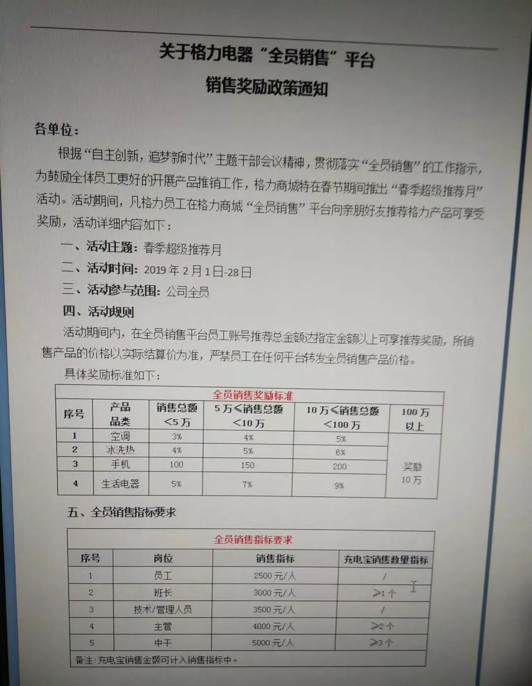 近日珠海格力电器启动了一项“全员销售”的计划,鼓励全体员工通过格力商城的“全员销售”平台向亲朋好友推销格力的产品,并为此制定了各级员工的销售指标和奖励标准。