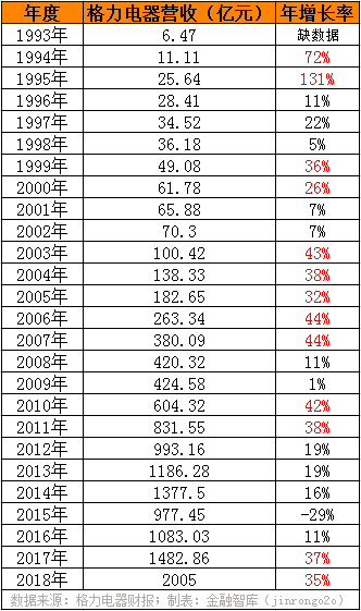 笔者整理了格力电器1993年以来的历年财报数据发现,过去25年中格力电器虽然有过14个年度的营业收入增长超过25%,但是大部分集中在2008年之前。