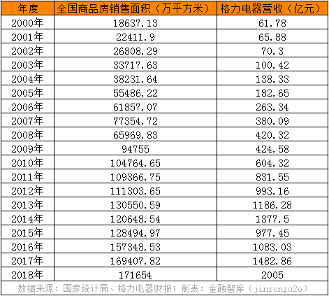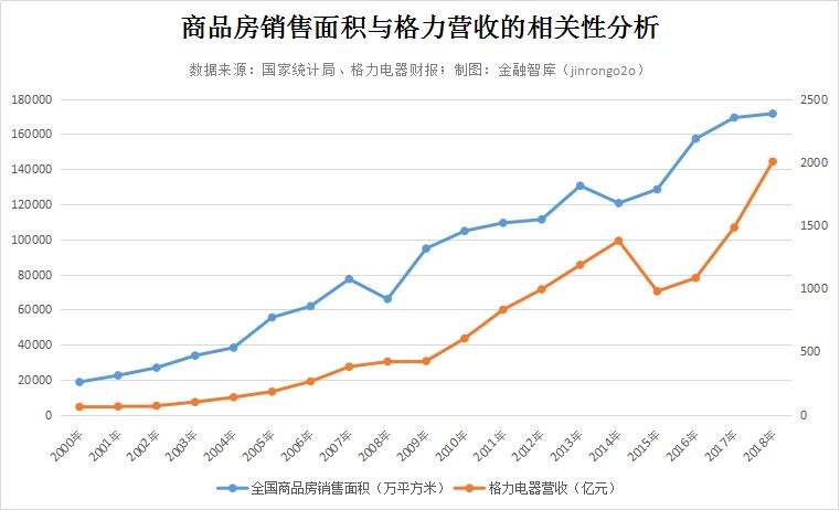 笔者从国家统计局查阅了历年的全国商品房销售面积数据,以及在同花顺上面查阅了格力电器历年财务报表的营业收入数据(注:2018年最终数据尚未公布,取格力电器业绩预告的中间值),通过制作图表对比发现,格力电器的营业收入跟全国商品房销售面积具有高度的相关性,并且滞后于全国商品房销售面积一年左右。