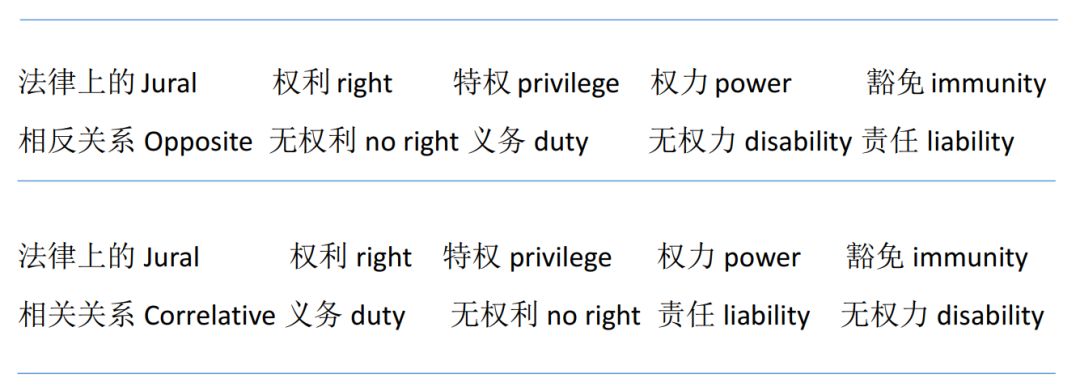 在霍菲尔德看来,我们迫切需要对法律关系进行“更加深刻的理解和认知”,并重新对法律关系的基本要素进行了划分和区别,最终形成了八个更小的法律关系概念,在中国政法大学王涌教授的另一篇文章里,将这种做法描述为“寻找法律概念的最小公分母”。