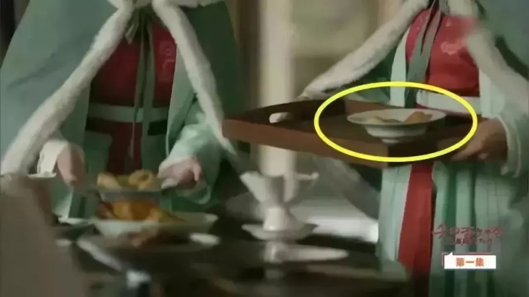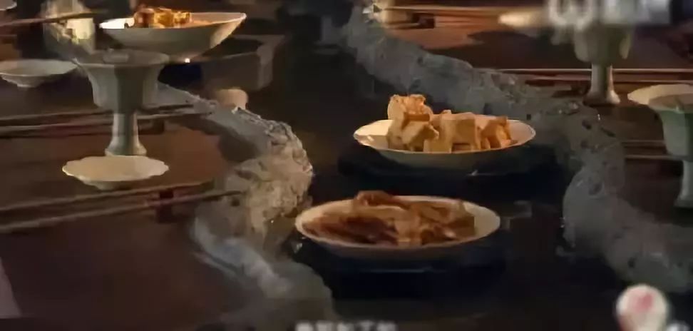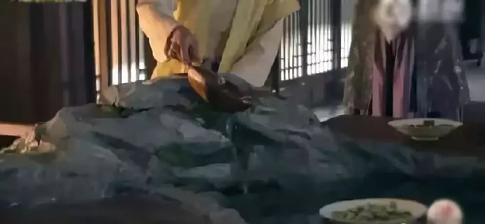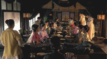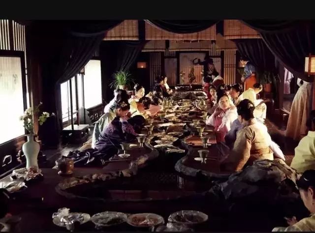 剧中还有很多次宴会的描写,其中让人印象最为深刻的,便是曲水流觞席。宾客坐在席水的两侧,各色茶点顺着水流,流动到每个宾客的面前,整个过程十分优雅。此场景是根据王羲之《兰亭序》的描述来改编的。