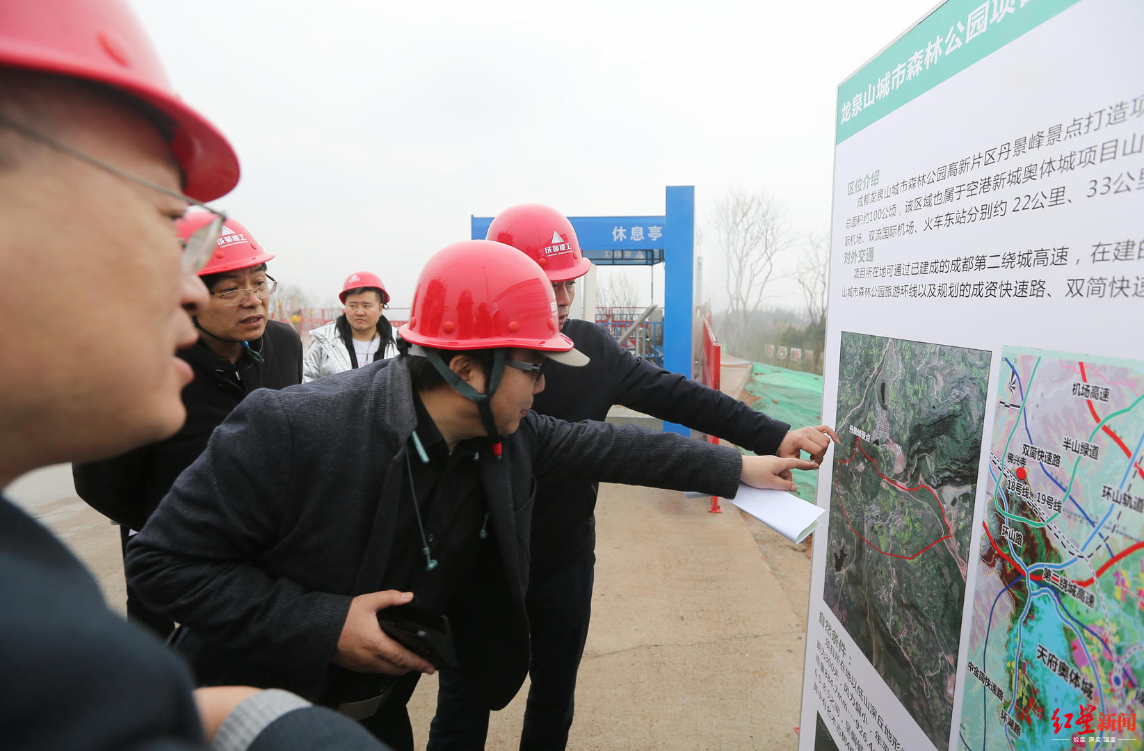 ↑专家们在丹景台景区现场踏勘龙泉山城市森林公园南段示范区内27平方公里启动区。