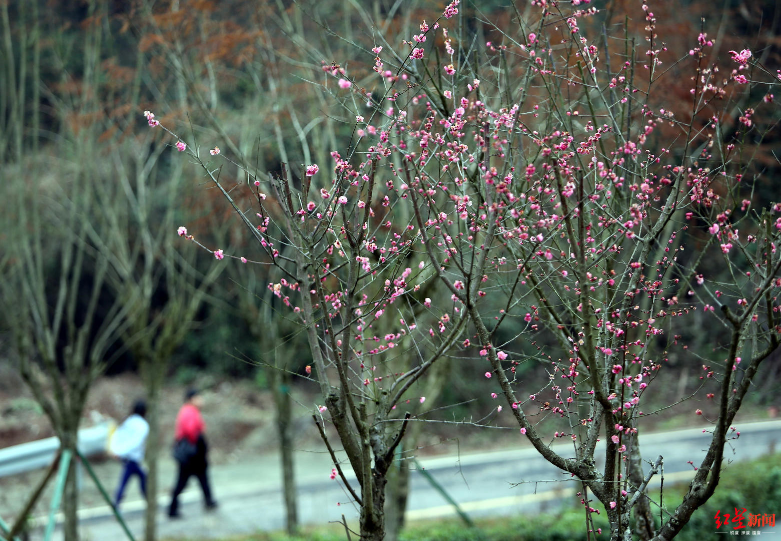 ↑狮子宝景区的梅花已开,附近村民在游览景区。