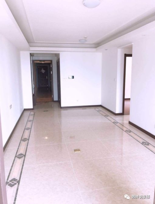 玄关进来就是开放式小餐厅,精装房就是这样,效果非常的简洁清爽。瓷砖地板搭配大白墙的设计,天花板的灯带吊顶和客厅是连一起的。