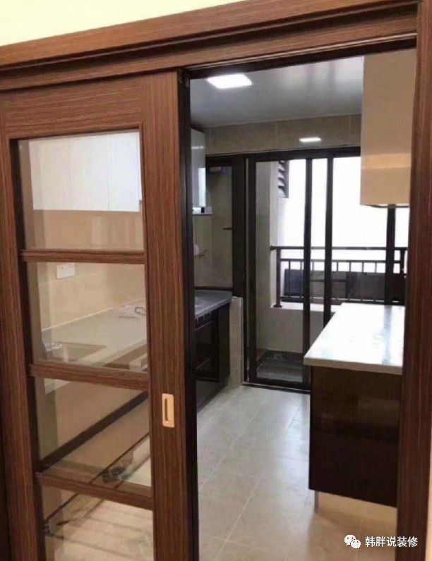 厨房就在玄关柜的对面,装了木质框的玻璃推拉门充当隔断。厨房里面有两个工作台,并且都装了橱柜和吊柜,小空间的收纳功能也能够特别强大。