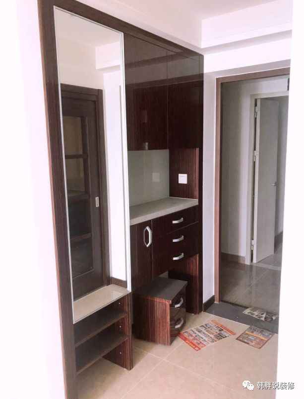 进门的右手边是嵌入式的玄关柜,上面是收纳柜,中间有凹槽,下面有抽屉和换鞋凳,边上有整身镜和收纳鞋架。小小的玄关,几乎包容了所有该有的设计,关键效果还特别好看。