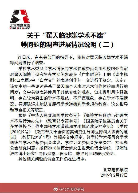 2月11日,媒体从北京电影学院了解到,学校对此事件高度重视,已经成立调查组并按照相关程序启动调查程序。学校表示高度重视学术道德建设,对学术不端行为持零容忍态度。