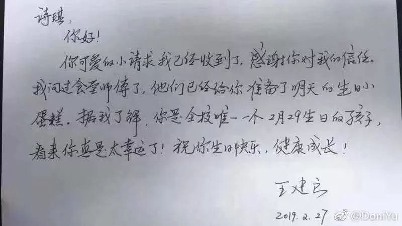 “诗琪,你可爱的小请求我已经收到了,食堂师傅给你准备了生日小蛋糕,你是全校唯一一个2月29日生日的孩子,你真是太幸运了。祝你生日快乐!”
