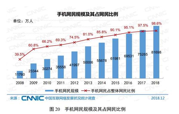 《报告》显示,截至2018年12月,我国网民规模为8.29亿,全年新增网民5653万,互联网普及率达59.6%,较2017年底提升3.8个百分点。其中,我国手机网民规模达8.17亿,全年新增手机网民6433万;网民中使用手机上网的比例由2017年底的97.5%提升至2018年底的98.6%。
