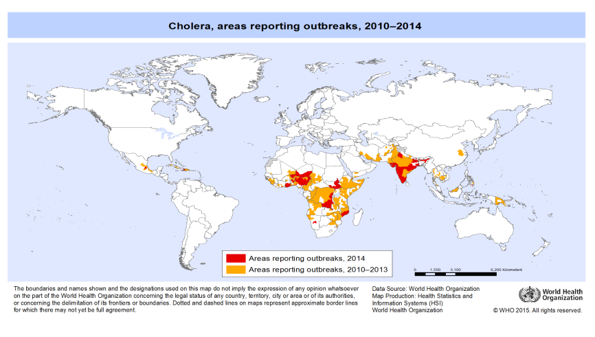 根据世界卫生组织统计,2014年全球共报告了14万例霍乱病例,超过2000人因此死亡,疫情主要发生在海地、加纳、南苏丹、印度和孟加拉国等国。2015年,坦桑尼亚、刚果、肯尼亚、伊拉克等国也爆发了霍乱疫情,其中以坦桑尼亚最为严重,共有4900多例。2018年,非洲多国爆发霍乱疫情,包括阿尔及利亚、尼日尔、津巴布韦等。