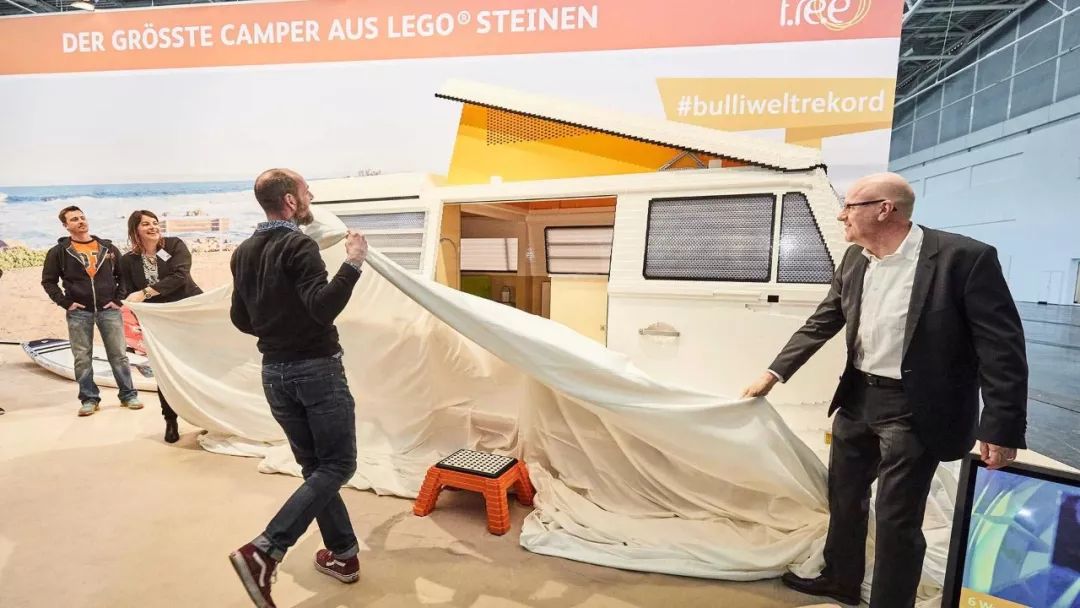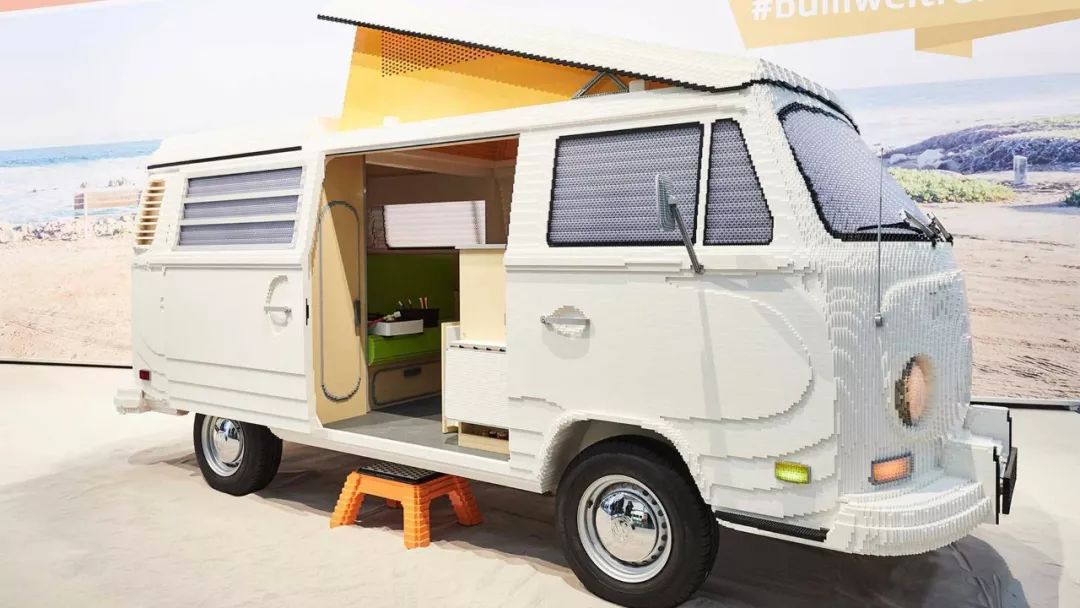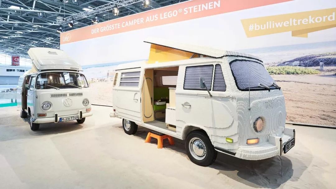 1:1比例的全尺寸大众 Volkswagen T2 camper 露营车 LEGO 乐高版亮相德国慕尼黑 F.re.e Leisure and Travel Fair 休闲和旅游博览会:不仅还原了 T2 面包车的外观、高顶,露营车内部装潢也如数呈现!