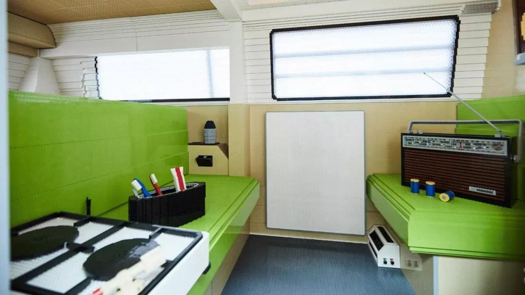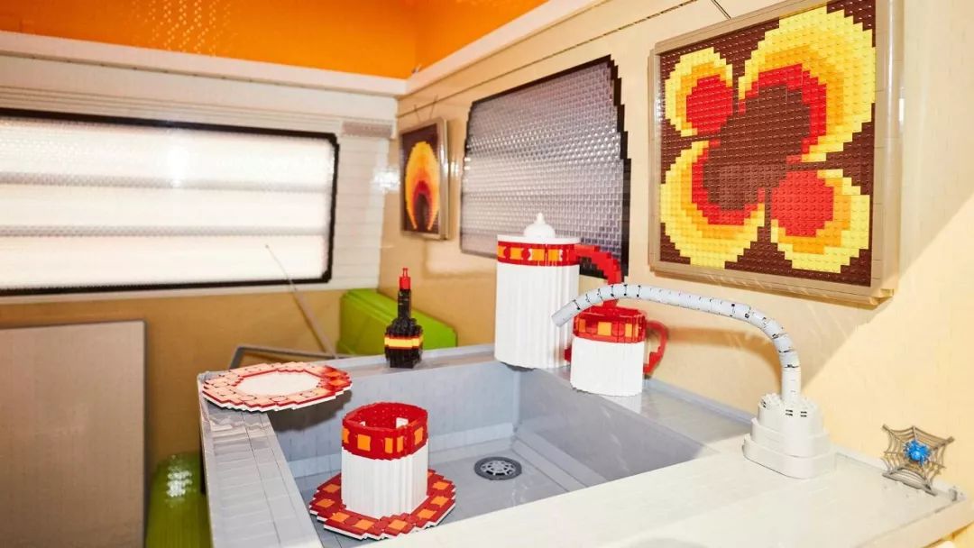 除了全尺寸的大众 T2 外观,还有可动的高顶和侧开车门,甚至可以进入这台乐高 LEGO 露营车内!此外,车舱里还有乐高版收音机、餐具和其他生活用品(甚至还有蜘蛛网)。