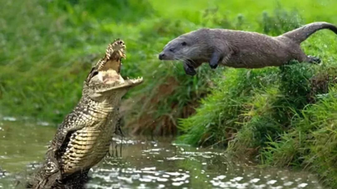 鳄鱼是水中生物闻风丧胆的猛兽,而它见到成群结队的水獭只能老实示弱,但这还没完,即使主动示弱也会被美洲水獭们轮番挑衅,如果几个回合的战斗下来,鳄鱼被水獭前后夹击,占不到任何便宜,只能乖乖投降,狼狈逃窜。