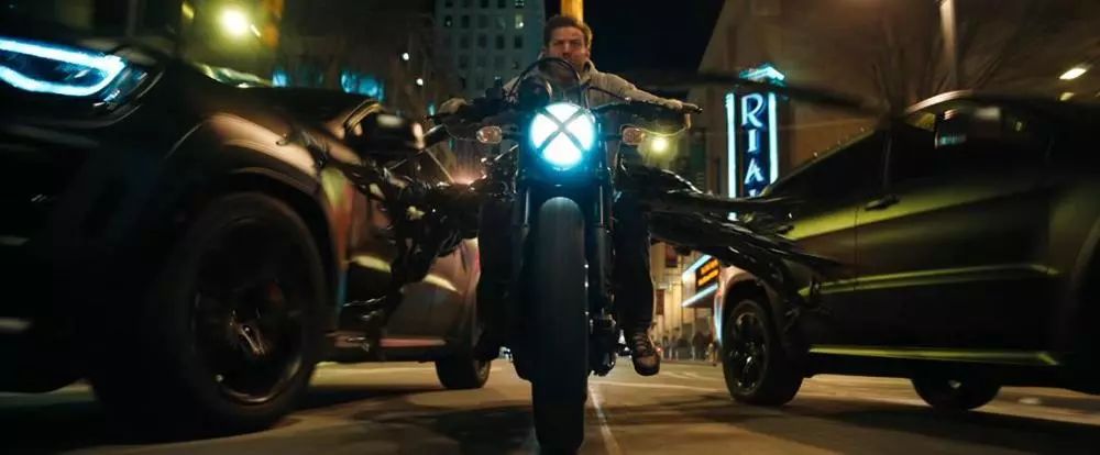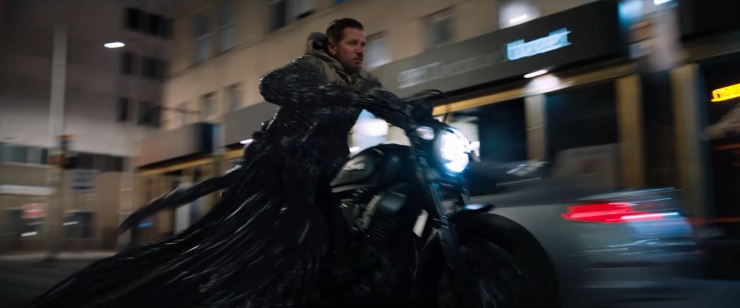 对于埃迪·布洛克驾驶杜卡迪穿越城市的一些镜头,汤姆·哈迪实际上两腿分开坐在一辆固定在特技拖车上的摩托车上;然后用一辆摄影车,或全地形车甚至另一辆摩托车以每小时60英里(96公里)的速度牵引着拖车。通过使用车载液压系统和伺服马达系统,操作人员将拖车上的车左右倾斜,以及做前轮离地或后轮离地的表演。哈迪还在由LED平板灯照亮并被蓝屏包围的由万向架固定的车上进行表演,DNEG将这些画面和用一辆带八台摄影机阵列的车辆拍摄的360度城市背景合成。“我们制作了这个摄影机阵列的一个虚拟副本,”格纳斯说,“由于摄影机安装在坚固的底座上,所以我们只需在一个背板画面里进行运动反求,剩下的摄影机遵循同样的运动。”每当前景摩托车上的摄影机移动偏离相关布景时,摄影师们就会将背景镜头重新投射到基于激光雷达的几何图形上,并使用定位摄影和数字绘景来补充缺失的信息。制作师们制作了一辆CG杜卡迪,以增强实拍摩托车的反射效果。“如果我们不想完成整个照明流程,我们将使用CG摩托车的几何缓存来运行额外的铬层,然后在合成中创建我们自己的反射。”
