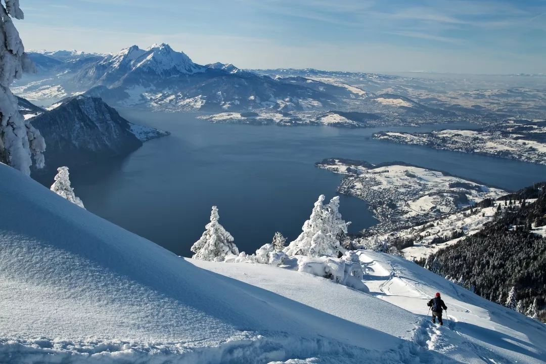 瑞士卢塞恩湖上方的瑞吉山的雪地,远方是位于卢塞恩右侧的皮拉图斯山(Mount Pilatus)。2018 年年初,杨立新、杨玏一家曾在这里旅行。