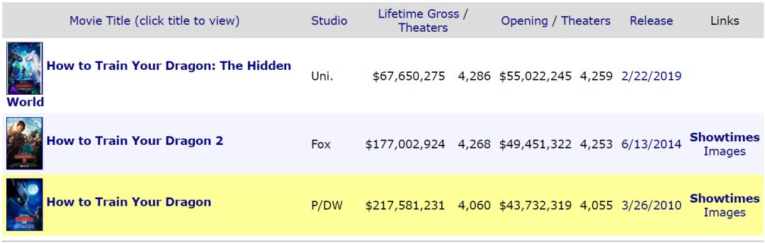 事实上,这也是这一系列的高光时刻。2010年,派拉蒙发行了《驯龙高手》,向全世界介绍了维京少年小嗝嗝和他的龙“无牙仔”的故事。当时,这部影片的首周末票房达到了4370万美元,并在全球范围内创造了超过4.94亿美元的收入。随后2014年,《驯龙高手2》开画,首周末票房也有所增长,达到4940万美元,全球收入超过6.21亿美元。