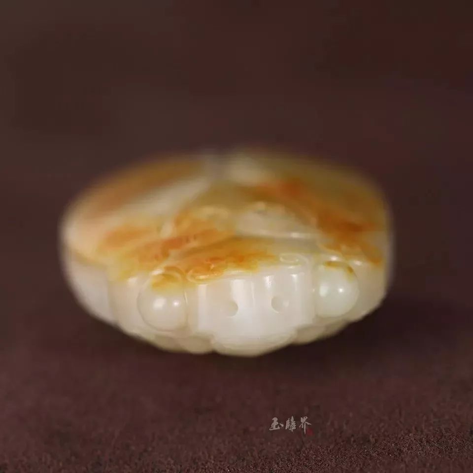玉质浑厚浓糯,莹洁细腻。留整面天然聚黄皮,皮色艳丽无俦,不可多得。玉蝉形状饱满,羽翼贴合,整体造型柔美饱满,富有张力,体现作者细腻的观察与精湛的技艺。