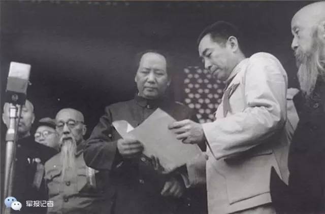 1949年10月1日,周恩来和毛泽东在天安门城楼上。