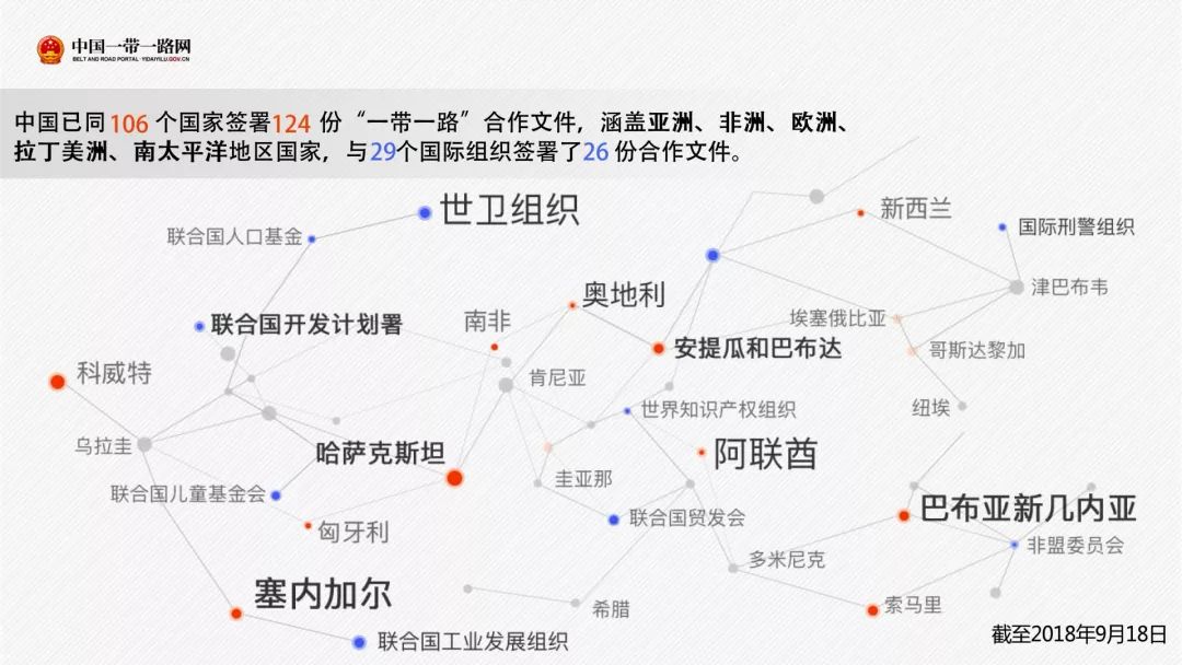 截至2018年9月18日,中国已与106个国家和29个国际组织签署了150份“一带一路”合作文件,涵盖亚洲、非洲、欧洲、拉丁美洲、南太平洋地区国家。