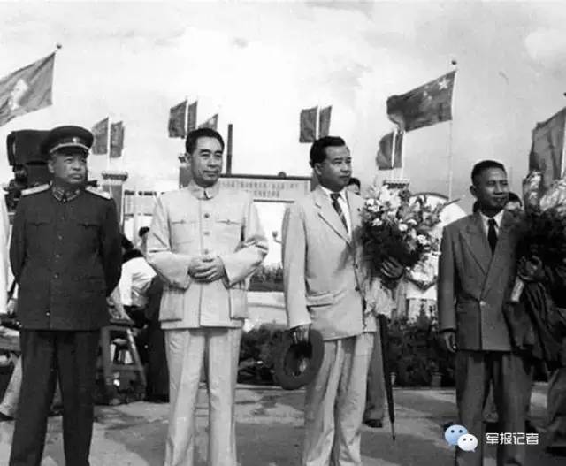 1956年8月周恩来与彭德怀在北京机场迎接老挝首相富马亲王访华