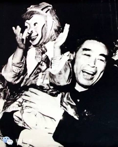 1957年12月周恩来观看绍剧后与小演员小六龄童留影