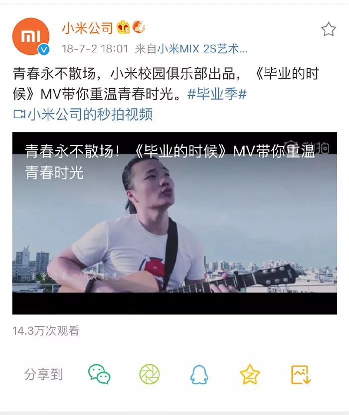 《毕业的时候》这首MV是去年发布的了,不过小米公司昨晚也悄悄删了这条宣传MV的微博,刚刚验证了下在小米公司官微上搜索这个微博已经没了,显然小米也注意到了这首MV与《爱华为》作者之间的关联,为了避免留下把柄现在才去删除这个微博。