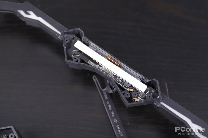 散热器正面的GeForce RTX logo下的真面目,一条发光模块和下面两个8针脚用来固定风扇模块的插座。