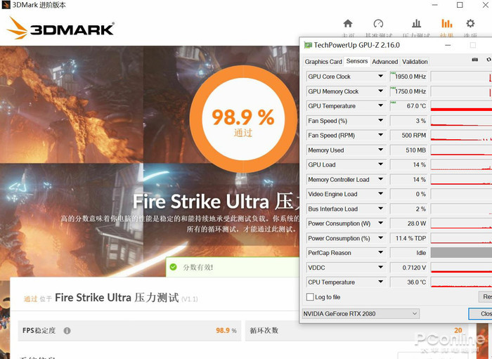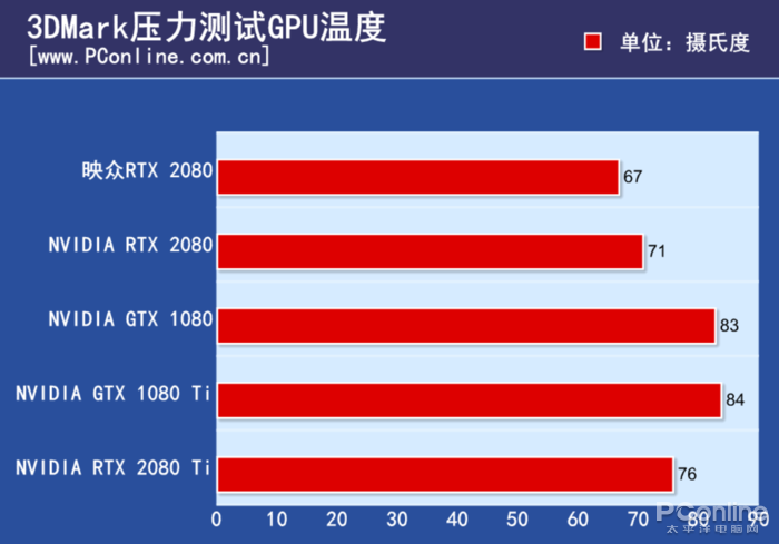 温度方面,映众RTX 2080冰龙跑压力测试时达到了67度,偏高了一点, 可能与当时的天气有关。但它的温控表现仍然是比较优秀的,看下面噪音测试。