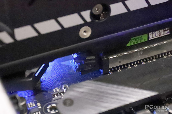 显卡背板,看着感觉比较厚,其实亚克力板占比较多,让整体看着更厚了,而背板的发光部分也非常的多,官方对这块显卡的宣传语就是“追光逐映”,灯效方面应该会有很酷炫的表现。