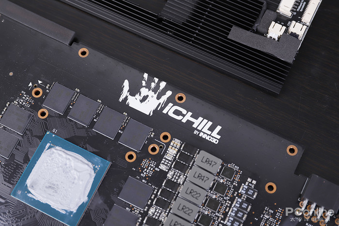 这里就是这条冰龙散热最重要的地方了,整块均热板覆盖了显存与供电模块,中央的胶贴下就是温度传感器,实时监控元件温度并反馈到上方温控芯片,实现分区控制风扇转速,智能控温调速,高效散热。