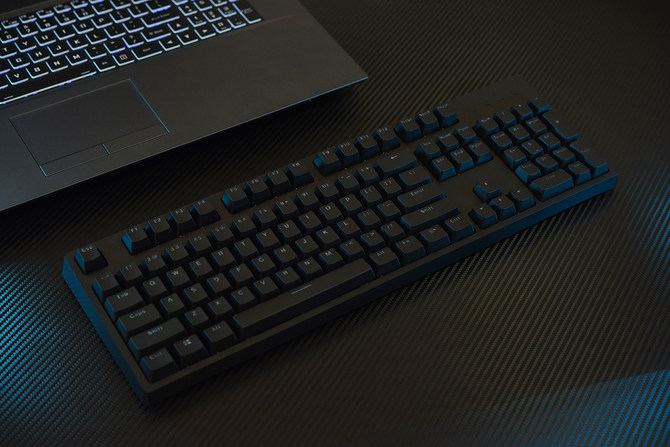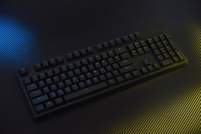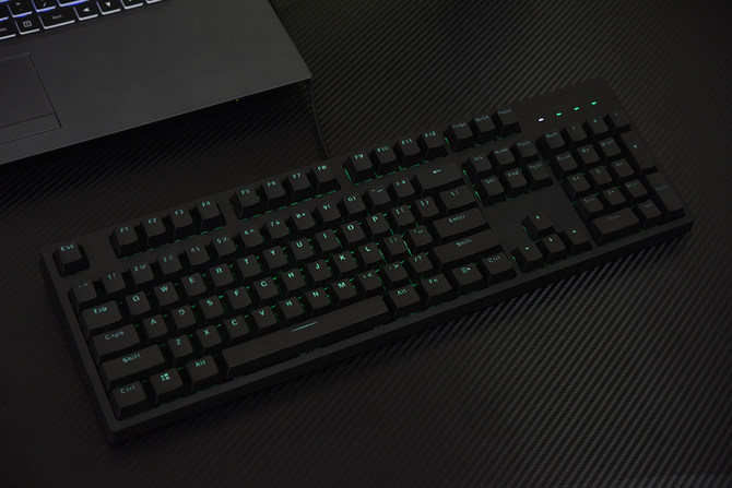雷柏V808RGB在外观设计上并没有采用太多花哨的设计,三围达到了445mm×144mm×41mm,而表面材质虽然采用了ABS,但键盘重量还是打到了1.1Kg,给人第一印象就是十分低调、沉稳扎实。