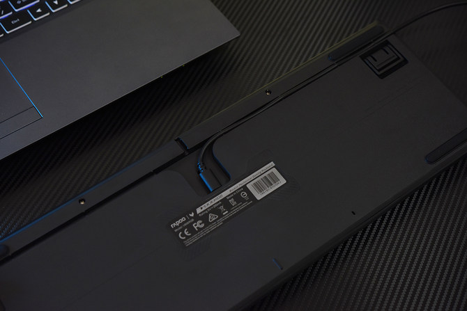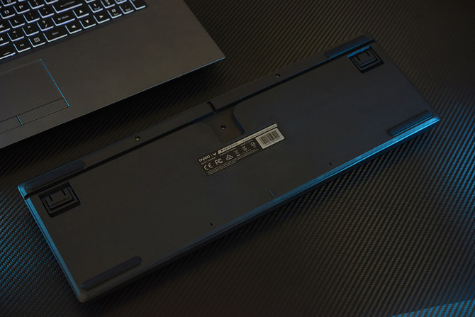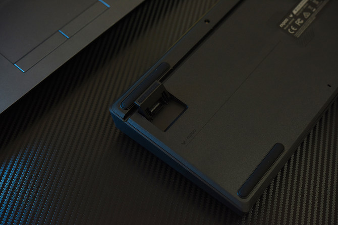 键盘底部同样采用黑色磨砂ABS材质,中间贴有信息铭牌,下方有疏水孔,说明雷柏V808RGB具有一定的防水能力,在遭受到液体入侵时能快速将液体排出,避免积压在内部造成损坏,配有四块长条形防滑脚垫,脚撑部分采用两级设计,可以更精准的调整到合适的高度。